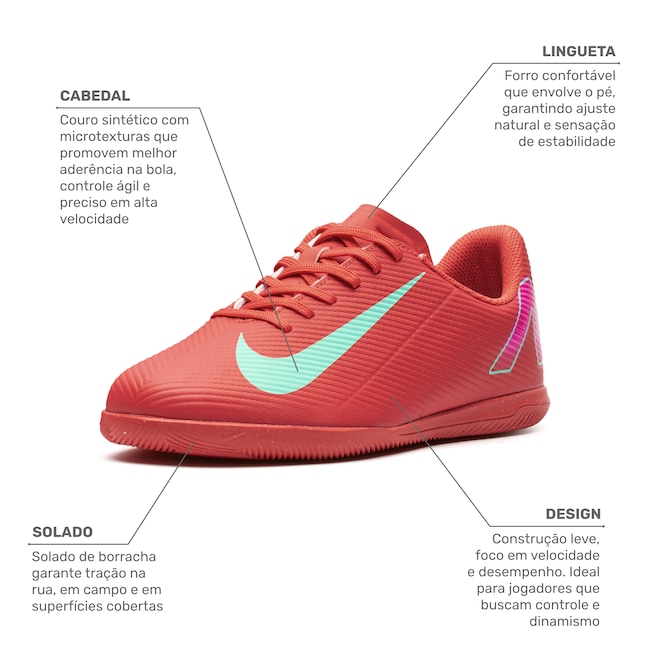 A Chuteira Futsal Nike Mercurial Vapor 16 Club IC Júnior é a escolha perfeita para jovens atletas que buscam desempenho e conforto. Com um cabedal sintético de alta qualidade, ela oferece durabilidade e ajuste preciso. O solado emborrachado garante tração superior em superfícies internas, enquanto a palmilha forrada proporciona conforto durante todo o jogo. O reforço acolchoado no calcanhar adiciona proteção extra contra impactos. Ideal para quem deseja acelerar o jogo e dominar as quadras.