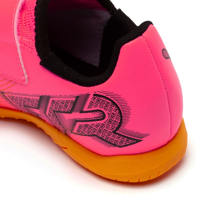 Possui fechamento em velcro que facilita o ajuste e oferece uma fixação segura e prática, permitindo que as crianças coloquem e tirem a chuteira com facilidade. Proporciona um ajuste firme e confortável ao pé, melhorando a sensação de segurança e controle durante o jogo.