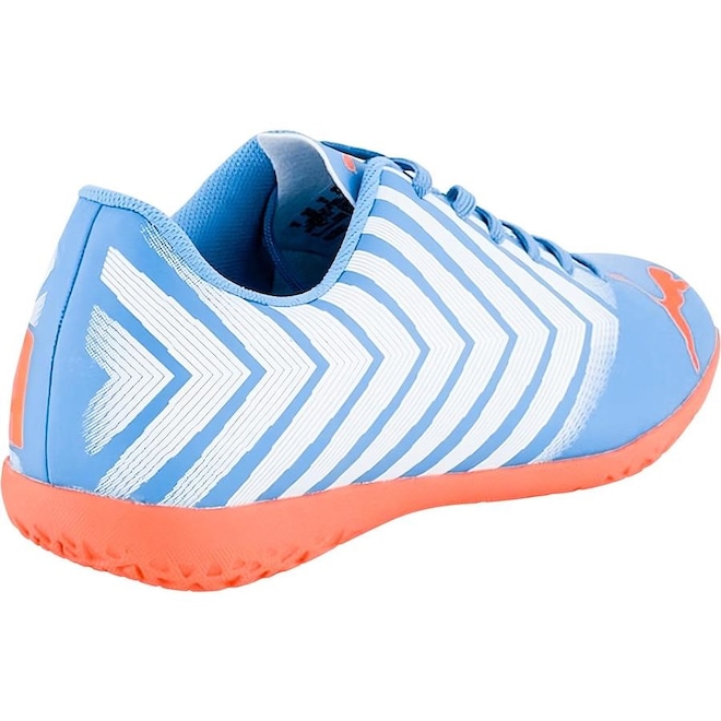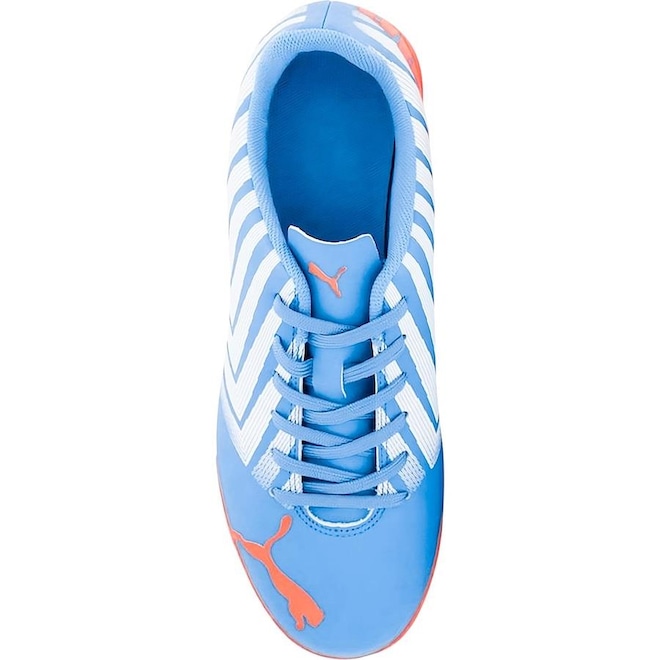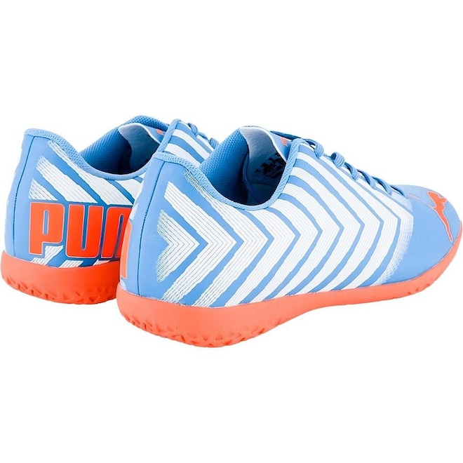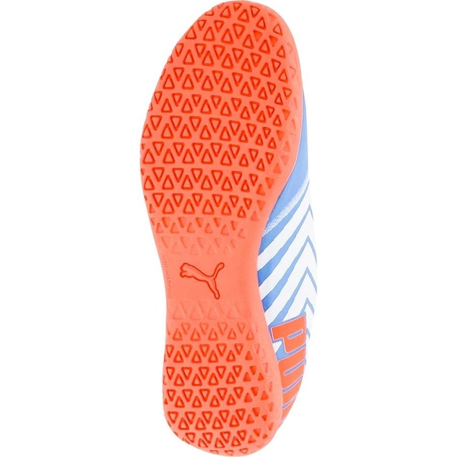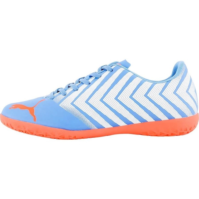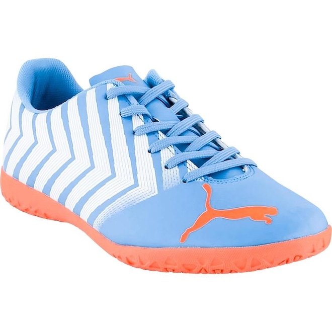 O cabedal (parte superior do calçado) da chuteira futsal Puma é em material sintético, amarração em cadarço, palmilha macia e removível, lingueta fina e flexível e forro com reforço acolchoado.