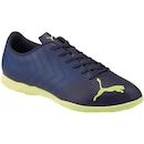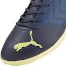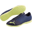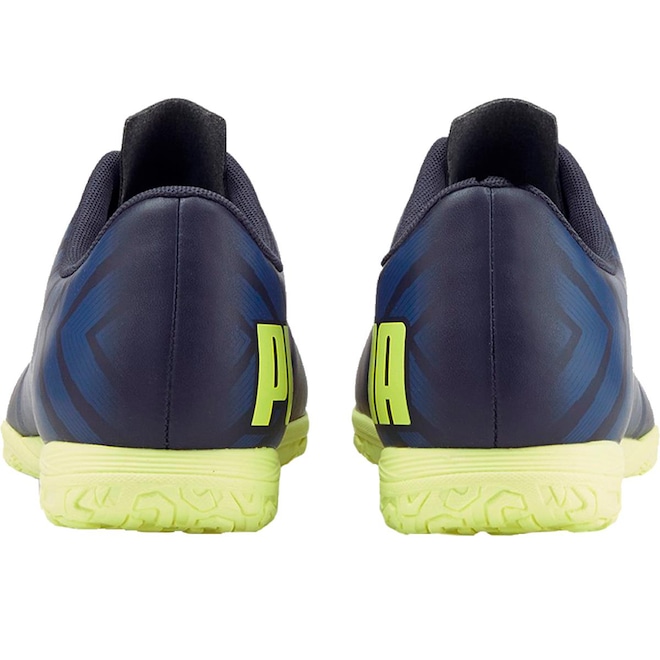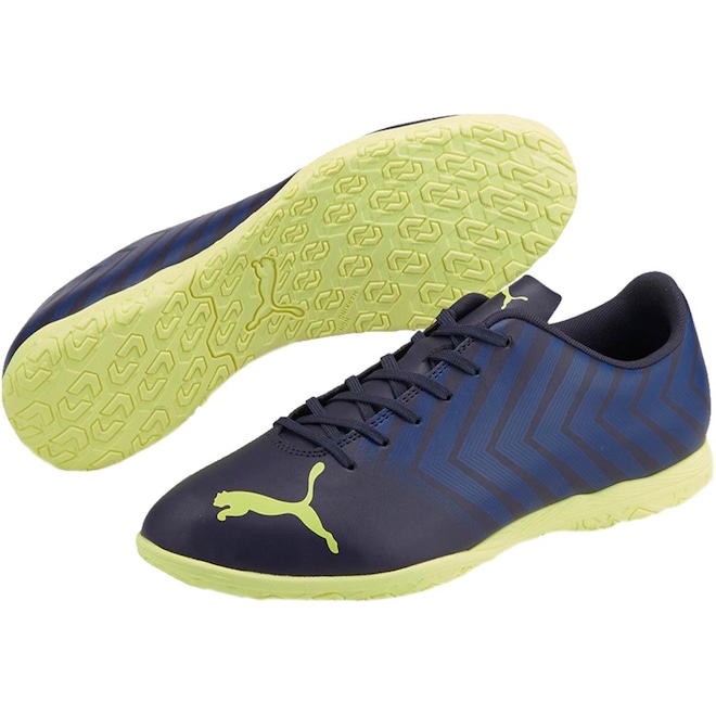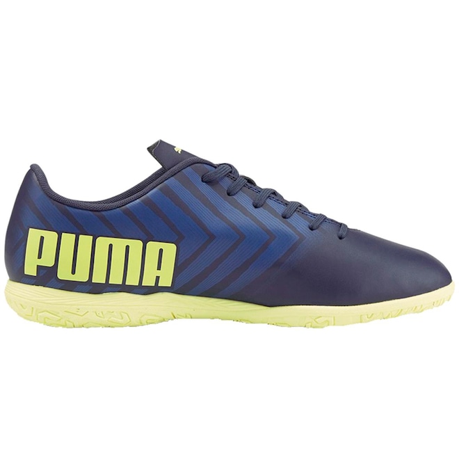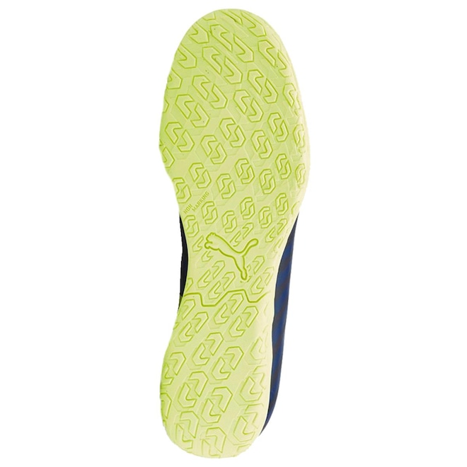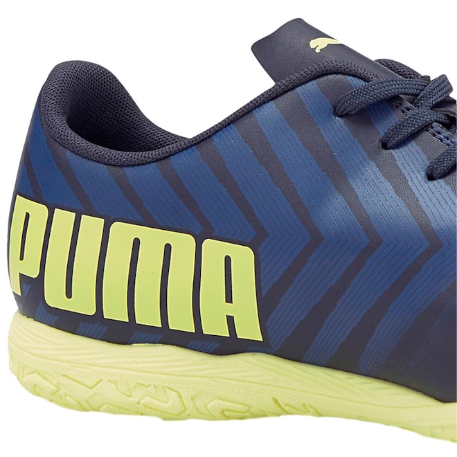 O cabedal (parte superior do calçado) da chuteira futsal Puma é em material sintético, amarração em cadarço, palmilha macia e removível, lingueta fina e flexível e forro com reforço acolchoado.