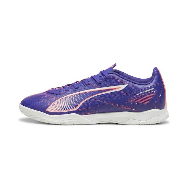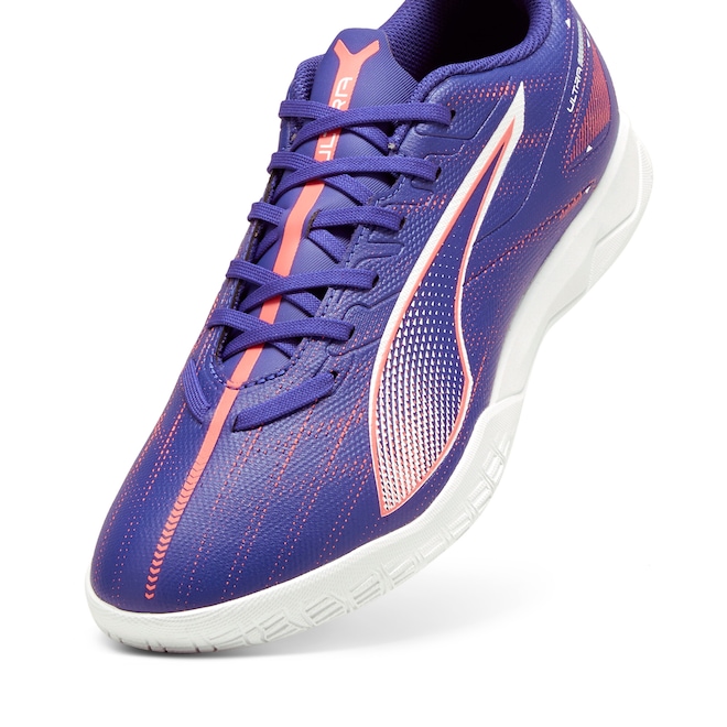 Qual é a velocidade de uma ULTRA 5 PLAY? Apertem o cinto. Esta chuteira apresenta uma estrutura de suporte leve que adiciona estabilidade ao cabedal, enquanto a sola interna de borracha de baixo perfil não deixa marcas e a torna adequada para uso interno. Onde quer que você jogue, jogue a todo vapor.