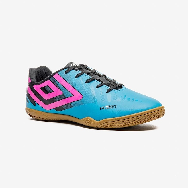 Indicada para jogadores iniciantes que se destacam dentro das quadras de futebol indoor, a Chuteira Futsal Umbro Action exibe artes gráficas personalizadas aplicadas em camadas, com efeito degradê, que oferecem um visual autêntico e moderno no melhor estilo Umbro. Cabedal confeccionado em material laminado. Possui grafismos em ?layers? com aplicação de verniz incolor sobre as artes, Diamante Umbro em destaque na lateral, assinatura do modelo na parte frontal e palmilha interna macia em EVA com tecido forrado. O solado de futsal é composto por blenda de PVC e TPU, que oferece aderência ao solo e durabilidade.ref: M14U1H