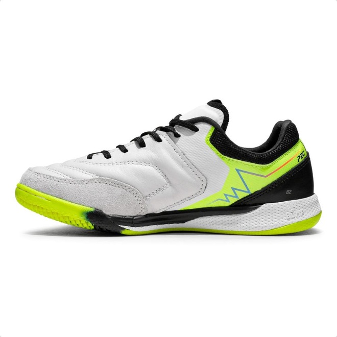 Solado de futsal ID traz entressola BUMP com grafismo bicolor e soleta de base em borracha antiderrapante bicolor.