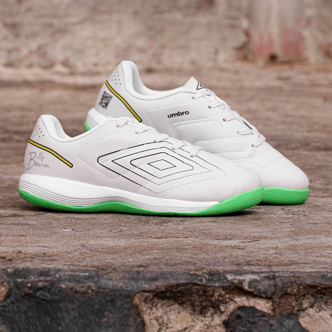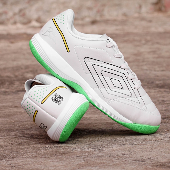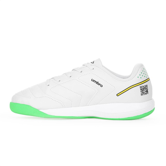 Controle total para os futuros craques das quadras! Chuteira Umbro Futsal BR Futsal Jr Branco Verde e Amarelo - Juvenil Ficha Técnica: Cabedal: Sintético emborrachado com costuras reforçadas Cor: Branco com detalhes em verde no solado, amarelo e preto Forro: Poliéster Fechamento: Cadarço Palmilha: EVA na cor azul forrado para maior conforto (90% EVA e 10% Poliéster) Solado: Borracha antiderrapante para máxima aderência (60% EVA e 40% Borracha) Diferenciais: Grafismo exclusivo e QR Code para acesso a página oficial BR Futsal Indicação: Futsal, treinos e partidas em quadra Gênero: Juvenil Detalhes: Billy Br Futsal e Diamante Umbro na lateral Destaque seu pequeno em quadra com um modelo criado em parceria com Billy do canal BR Futsal! Por que investir nessa chuteira? A Umbro BR Futsal Jr combina estilo e desempenho, oferecendo cabedal resistente, solado antiderrapante e ajuste confortável para jogadas precisas. O grafismo exclusivo e o QR Code integrado conectam os pequenos ao universo do futsal. Experimente o conforto e a tecnologia que os futuros craques merecem! Conteúdo da embalagem: 1 par de Chuteira Umbro Futsal BR Futsal Jr Branco Verde e Amarelo – Juvenil