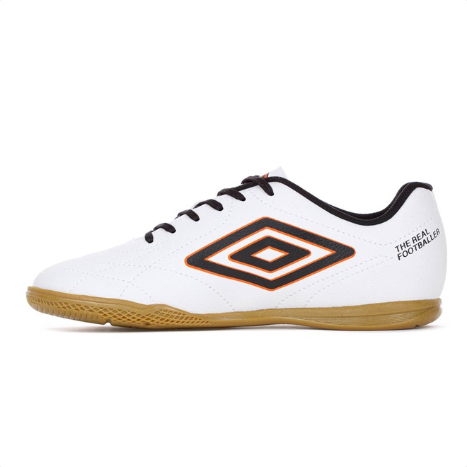 Precisão, conforto e controle para dominar as quadras! Chuteira Umbro Futsal Class Footballer Branco Preto e Laranja - Masculino Ficha Técnica: Marca: Umbro Cor: Branco Preto e Laranja Cabedal: Sintético laminado com textura de couro relax Gênero: Masculino Forro: Poliéster Palmilha: EVA forrado em tecido (90% EVA, 10% Poliéster) Solado: Borracha antiderrapante e monocolor com tecnologia HYPERGRIP para mais tração e aderência Lingueta: Fina e flexível Fechamento: Cadarço Indicação: Jogos de futsal para jogadores intermediários Detalhes: Artes gráficas em serigrafia, logo Diamante centralizado na lateral da chuteira e frase The Real Footballer na lateral Seus passes e finalizações não têm a precisão que você deseja? A falta de aderência no solado pode comprometer sua performance? Com a Chuteira Umbro Futsal Class Footballer, isso não será mais um problema! Por que inovar? Projetada para jogadores que buscam um desempenho superior, ela oferece um cabedal em material sintético com textura de couro relax para maior controle da bola, além de um solado antiderrapante HYPERGRIP que garante máxima estabilidade nos dribles e chutes. Seu jogo merece um upgrade - escolha a chuteira que acompanha seu ritmo e eleva sua performance! Conteúdo da embalagem: 1 par de Chuteira Umbro Futsal Class Footballer Branco Preto e Laranja - Masculino