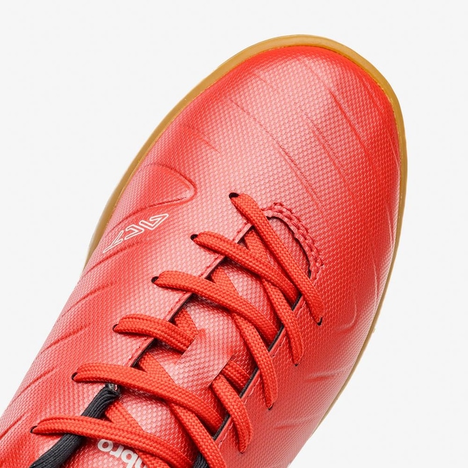 A boca deslocada para o lado externo da chuteira proporciona um ajuste preciso, permitindo um chute mais eficiente e melhor controle sobre a bola. Essa característica é fundamental para quem busca um desempenho superior em quadra.