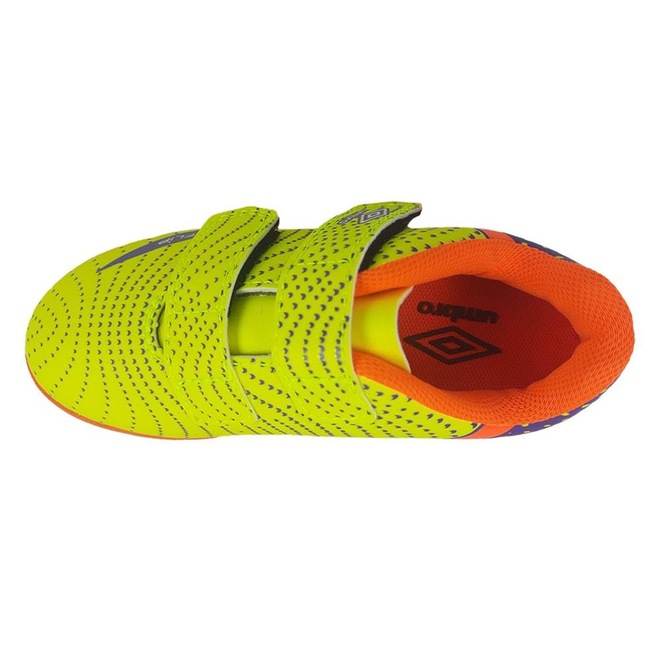 Os grafismos e detalhes estéticos do modelo trazem cores intensas e divertidas para as partidas e treinos. Cabedal confeccionado em material laminado. Possui grafismo com ilusão de ótica que passam a sensação de movimento, ajuste e fechamento em tiras duplas de velcro, Diamante Umbro aplicado na parte traseira e palmilha macia em EVA com tecido forrado.