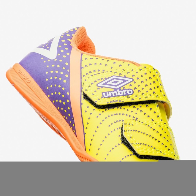 A Chuteira Futsal Umbro Flip Kids, desenvolvida exclusivamente para os jogadores mirins, vem com fechamento duplo em tela de contato, que garante praticidade e agilidade no calce, e cabedal em material laminado de fácil manutenção e limpeza. Os grafismos e detalhes estéticos do modelo trazem cores intensas e divertidas para as partidas e treinos. Cabedal confeccionado em material laminado. Possui grafismo com ilusão de ótica que passam a sensação de movimento, ajuste e fechamento em tiras duplas de velcro, Diamante Umbro aplicado na parte traseira e palmilha macia em EVA com tecido forrado. O solado de futsal é construído em borracha colorida com função antiderrapante.