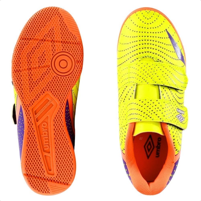 Diamante Umbro aplicado na parte traseira e palmilha macia em EVA com tecido forrado. O solado de futsal é construído em borracha colorida com função antiderrapante.