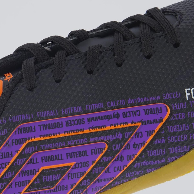 TecnologiasNon-Marking: Uma borracha que não marca a superfície e proporciona excelente tração.360 Zone: Proporciona ajuste envolvente ao redor do pé, oferecendo estabilidade e segurança em todos os movimentos.Soft Foam: Palmilha macia que absorve impactos, garantindo amortecimento e conforto durante partidas ou treinos.Composição cabedal (parte superior): Material sintéticoPalmilha: Em EVA e removível; facilita na higienizaçãoForro: Revestimento em material têxtil acolchoadoSolado: Borracha antiderrapante, coladoCor predominante: PretoLingueta: Fina e flexívelIndicado para: FutsalOrigem: NacionalAjuste: CadarçoPeso aproximado: 560g o par nº 40