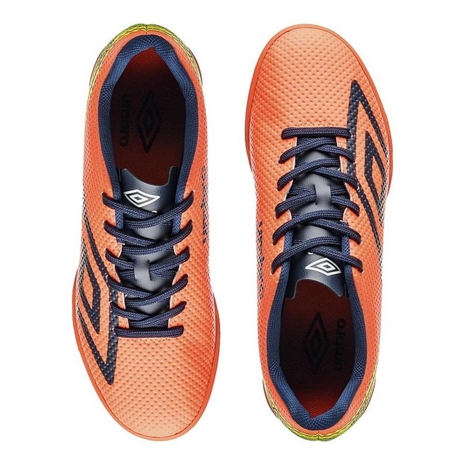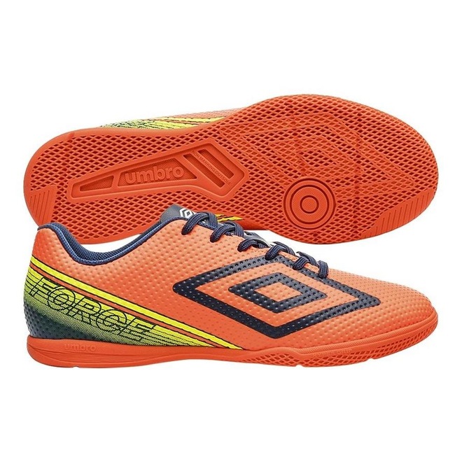 A Chuteira Futsal Umbro Force exibe um design despojado com degradê e bloco de cores. Indicada para jogadores iniciantes, ela traz textura integral e entrega de grip em toda a área da gáspea, que auxilia o controle direcional dos passes e dribles. Cabedal assimétrico construído em material laminado com aplique em cilindro de baixo relevo, que confere textura integral e maior grip ao entrar em contato com a bola, e forro em tecido de poliéster. Possui arte gráfica em estampa perfurada, Diamante Umbro aplicado na parte frontal, assinatura do modelo estilizada na parte posterior com contraste de cores, atacador convencional e palmilha interna em EVA forrado para maior conforto. O solado de futsal é composto por borracha, que proporciona maior aderência ao solo e durabilidade.