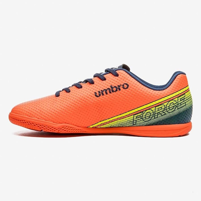 A Chuteira Futsal Umbro Force é ideal para jogadores iniciantes. Com design despojado e degradê, o modelo traz cabedal assimétrico em material laminado com textura de baixo relevo e forro em poliéster que garante maior grip e conforto. A arte gráfica em estampa perfurada, Diamante Umbro frontal e assinatura estilizada complementam o visual. O solado de borracha proporciona aderência e durabilidade nas quadras.ref: M15EXO