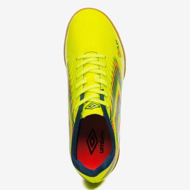 A Chuteira Futsal Umbro Play apresenta um design com efeito 3D e arte do diamante recortado. O cabedal (parte superior do calçado) é construído em material sintético laminado e texturizado, com aplicação de grafismos em linhas onduladas que sobrepõem o Diamante Umbro estilizado, proporcionando uma ilusão de profundidade e movimento em toda a lateral da chuteira. Possui palmilha macia em EVA e forro interno em poliéster. Contém solado de futsal em borracha.ref: M10YFV