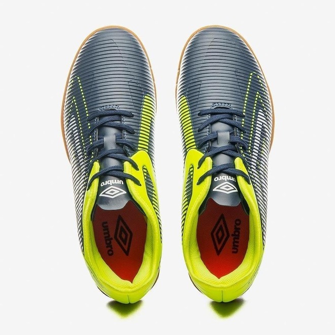 A Chuteira Futsal Umbro Stride vem com texturas alternadas em alto e baixo-relevo do tipo ?canelado?, garantindo um toque diferenciado que aumenta o grip e o efeito no momento do chute. Cabedal (parte superior do calçado) construído em material laminado com Diamante Duplo estilizado na lateral. Conta com forro interno em poliéster e palmilha super macia em EVA. Possui solado de futsal em borracha, proporcionando maior aderência ao solo. MARINHO,LIMAO,BRANCOref: M1001Z