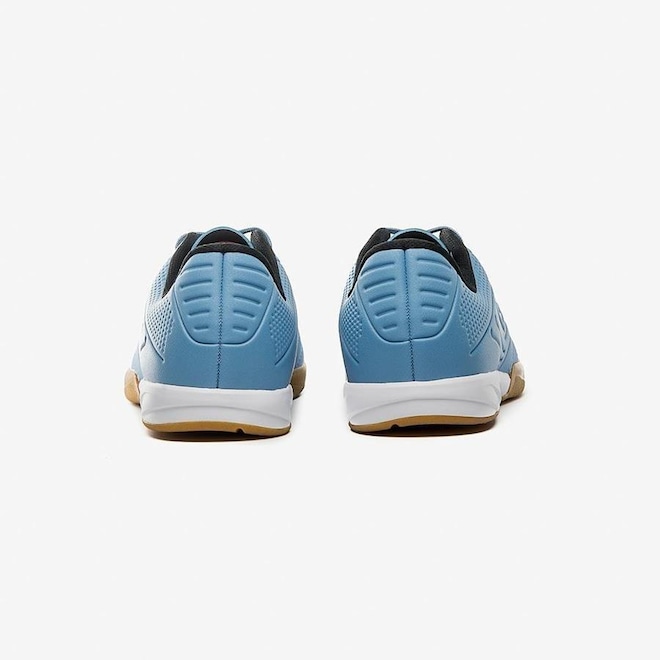O solado em borracha Non-Marking apresenta a tecnologia 360° Zone que proporciona aderência excepcional, permitindo movimentos rápidos e precisos, seja para driblar, chutar ou mudar de direção com agilidade.