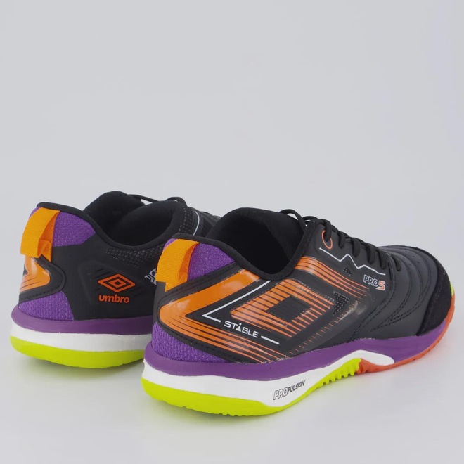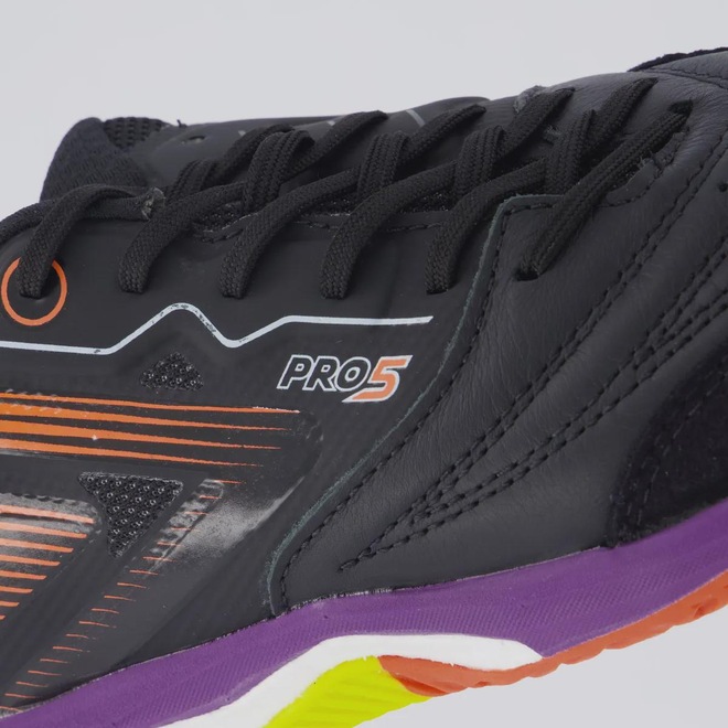 Tecnologia STABLE + PROPULSION: Garante estabilidade e impulso VORTEX GRIP: Oferece máxima aderência em diferentes superfícies HYPER GRIP: Proporciona tração superior para movimentos ágeis e precisos. Composição cabedal (parte superior): Couro e material sintético Palmilha: Em EVA e removível; facilita na higienização Forro: Revestimento em material têxtil acolchoado Solado: Borracha antiderapante, colado Cor predominante: Preto Lingueta: Fina e flexível Indicado para: Futsal Gênero: Unissex Origem: Nacional Ajuste: Cadarço Peso aproximado: 570g par nº 40
