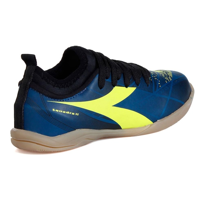 A Diadora Squadra II X Futsal Azul e Preto é indicada para jogos indoor, proporcionando mais controle, firmeza e conforto nas jogadas.