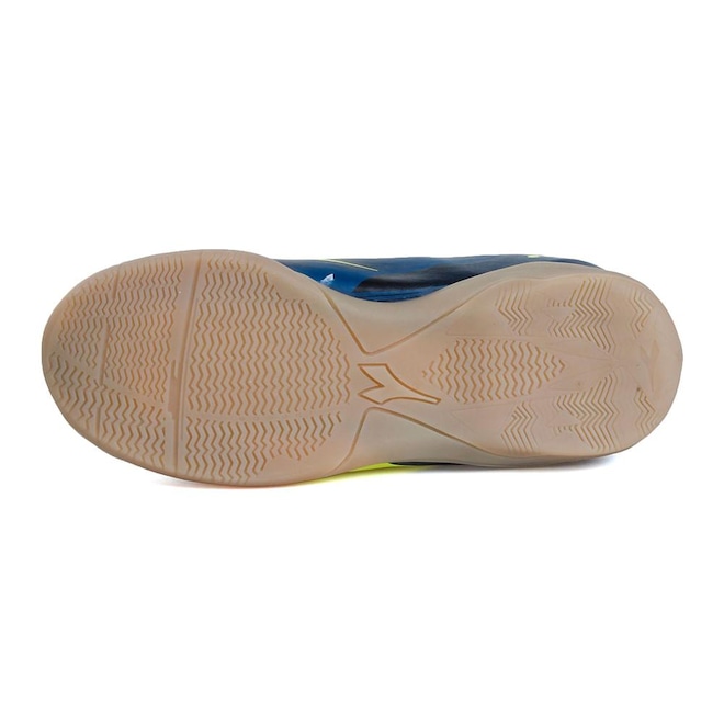 Produzida com cabedal em material sintético resistente, a chuteira possui forro em tecido respirável, palmilha em EVA que proporciona amortecimento e solado em borracha antiderrapante que garante tração e estabilidade em quadras lisas.