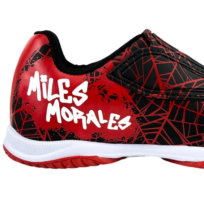 É um modelo para futebol futsal, possui velcro como fechamento, além de estampa temática dos personagens da Marvel.