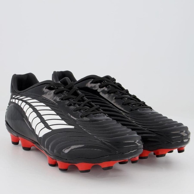 Tecnologias Anatomic Sys: Recortes anatômicos que permitem o encaixe perfeito do pé, além de flexibilidade total. HiperFlex: Canaletas posicionadas estrategicamente para auxílio na flexão e movimentação dos pés. Composição cabedal (parte superior): Confeccionado em material sintético Palmilha: PU conformada e removível; facilita na higienização Forro: Revestimento em material sintético com acolchoamento Solado: TPU, com travas circulares, altas e fixas Lingueta: Fina e flexível Cor predominante: Indicado para: Campo Origem: Nacional Ajuste: Cadarço Peso aproximado: 630g o par n°40ref: M0Z6LF