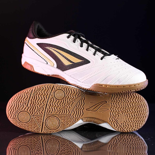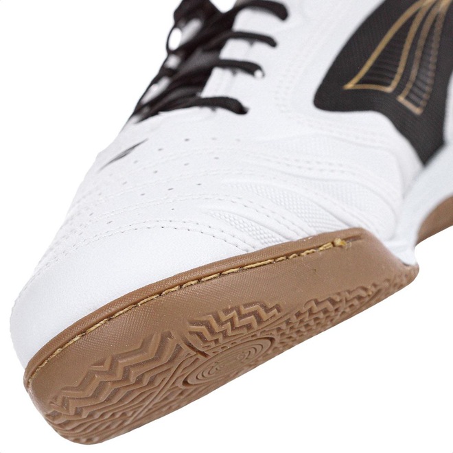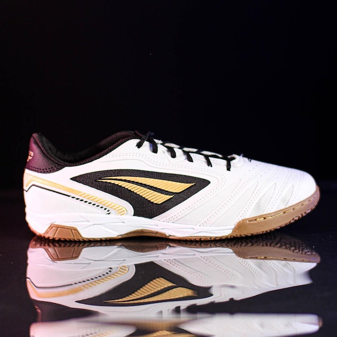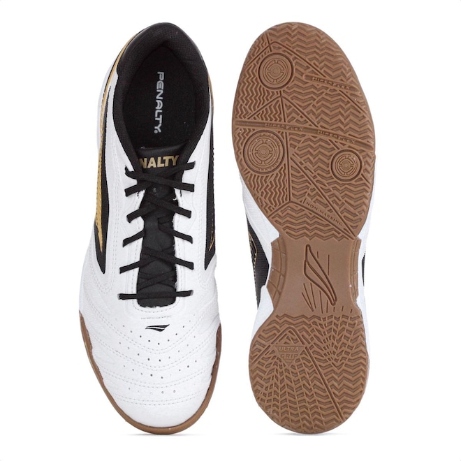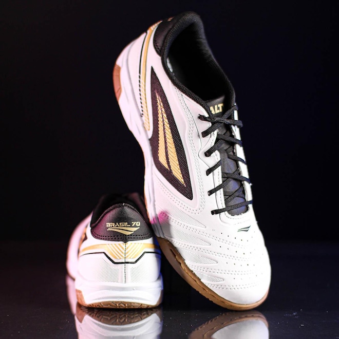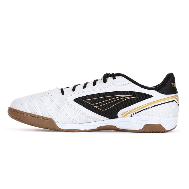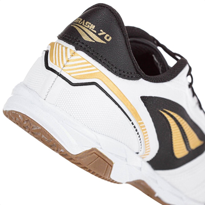 Chuteira Penalty Futsal Brasil 70 Y-1 Branco Preto e Dourado - Masculino: Desempenho e resistência para as quadras! Ficha Técnica Gênero: Masculino Indicado para: Futsal Cor: Branco, Preto e Dourado Cabedal: Micropower Solado: Borracha com tecnologias Non-Marking, Hiperflex, Rotate, Ultra Grip Palmilha: EVA Plana 3,5 mm Entressola: Neo Cushion Marca: Penalty   Conteúdo da embalagem: 1 par de Chuteira Penalty Futsal Brasil 70 Y-1 Branco Preto e Dourado - Masculino   A Chuteira Penalty Brasil 70 Y-1 oferece controle e durabilidade com cabedal em Micropower e palmilha em EVA para maior amortecimento. Solado com tecnologias avançadas, como Rotate e Hiperflex, para flexibilidade e aderência em qualquer movimento.