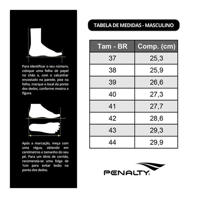 Experimente o máximo desempenho com a chuteira Futsal Penalty Bravo Y-3.0. Projetada para os amantes do futsal, elevando o jogo a um novo patamar. Com um solado de borracha, esta chuteira apresenta a tecnologia Hiper Flex, garantindo uma ótima flexibilidade durante os movimentos rápidos e explosivos do esporte. A palmilha de EVA Plana 3,5 mm proporciona um ótimo amortecimento e conforto para o jogador, especialmente nas corridas e movimentos laterais. A tecnologia Micropower no cabedal que oferece uma ótima durabilidade ao calçado. Uma escolha ideal para quem busca desempenho, conforto e durabilidade. Adquira já a sua ! Nome: Chuteira Society Penalty Bravo Y-3.0 Gênero: Unissex Tipo: Futsal Cabedal: Material resistente Micropower. Entressola: EVA Solado: Borracha. Tecnologias: Hiperflex e Non-Marking Definição da Tecnologia: Hiperflex: canaletas posicionadas estrategicamente para auxiliar na flexão e movimentação dos pés durante as arrancadas e mudanças de direção. / Non-Marking: Tecnologia aplicada na composição dosolado para não marcar o chão das quadras. Garantia: Produto Original com garantia contra defeitos de fabricação em até 90 dias após o recebimento da mercadoria. Origem: Nacional Marca: Penaltyref: M14FRC