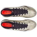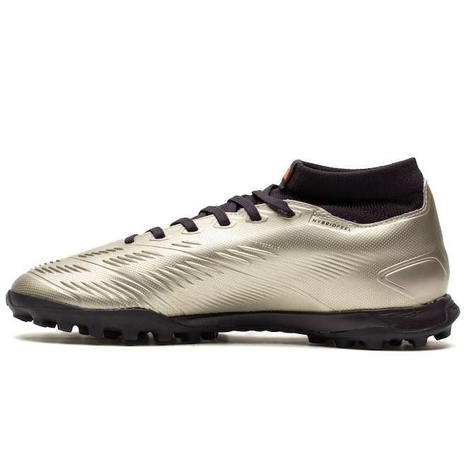 A palmilha forrada e o reforço acolchoado no calcanhar proporcionam um ajuste seguro e confortável. Esta chuteira conta com lingueta integrada estilo meia, oferecendo praticidade e ajuste anatômico.
