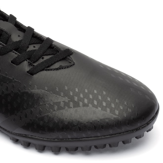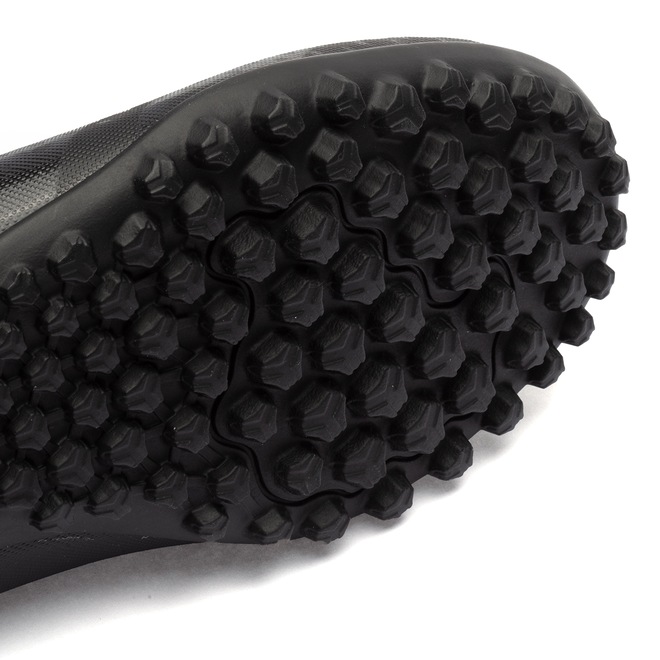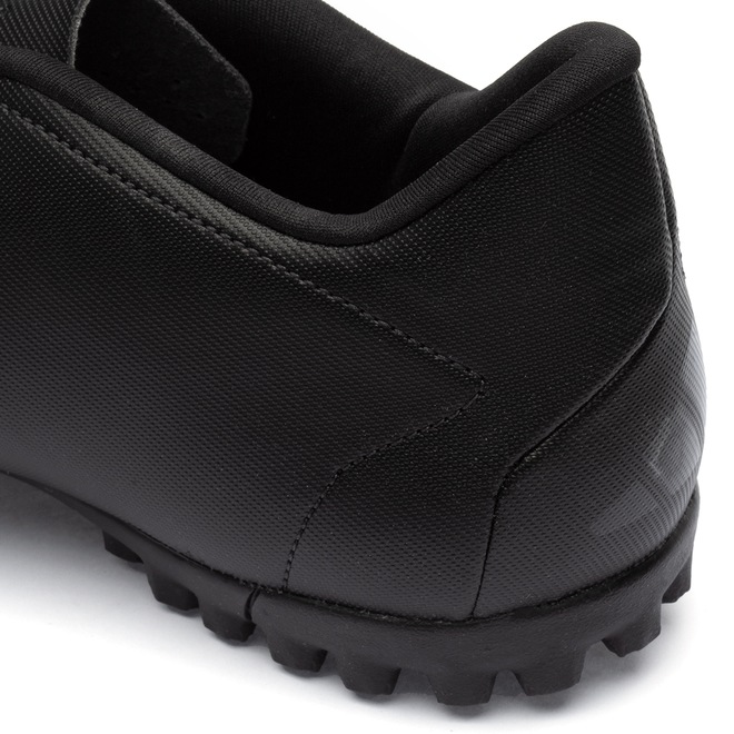 O cabedal da chuteira society é sintético, o solado é emborrachado e sua palmilha é removível.