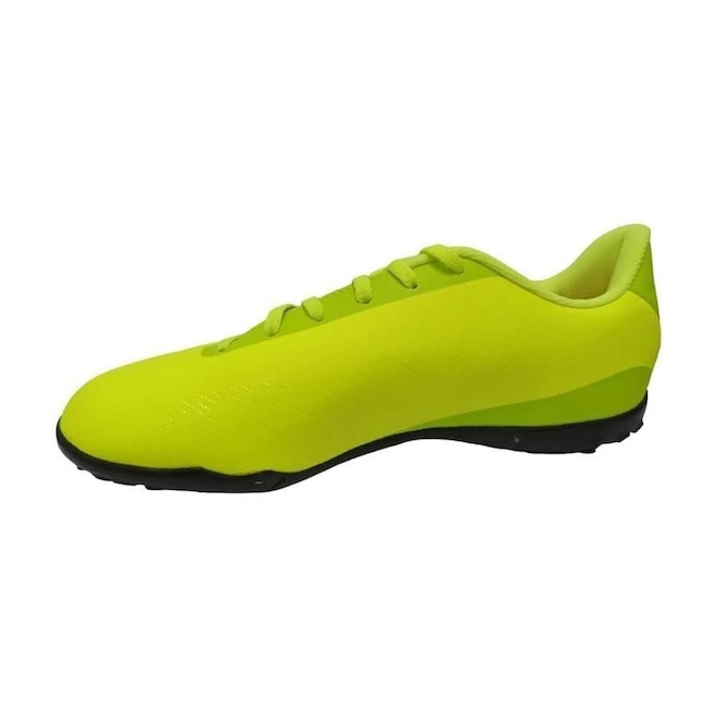 Com cabedal sintético, solado emborrachado e travas baixas e fixas, oferece estabilidade e aderência durante as partidas.