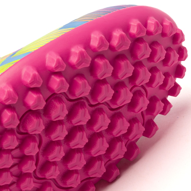 O solado de borracha com sulcos profundos proporciona excelente aderência em superfícies artificiais, permitindo dribles e arrancadas com máxima segurança.