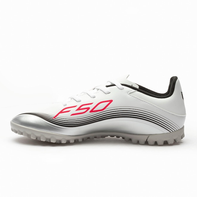 O solado de borracha com sulcos proporciona tração eficiente em gramados sintéticos, permitindo mudanças rápidas de direção com controle.