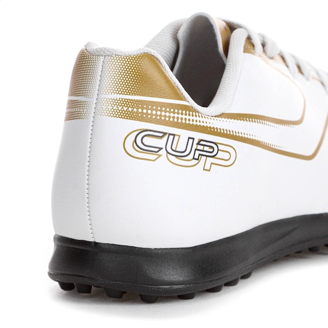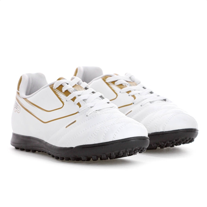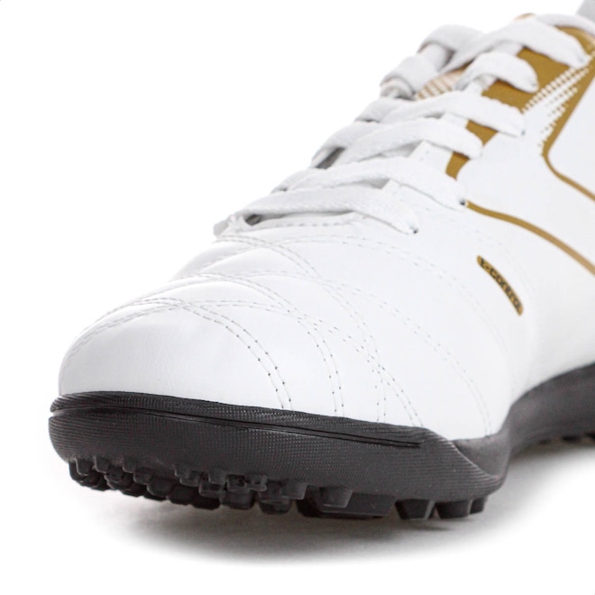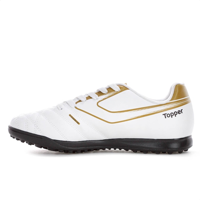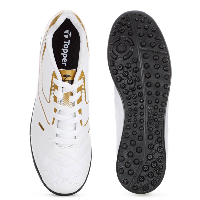 Controle total e agilidade para seu jogo fluir com estilo! Chuteira Topper Society Cup VIII Branco e Dourado - Masculino Ficha Técnica: Marca: Topper Cor: Branco e dourado Cabedal: Cabedal em sintético para resistência e flexibilidade Gênero: Masculino Palmilha: Têxtil Sola: Borracha Fechamento: Cadarço Estilo: Controle Trava: Sem Trava Tecnologias: Design leve para maior liberdade de movimento e cabedal macio para controle de bola Entressola: Solado projetado para grama sintética com excelente aderência e tração Indicação: Partidas e treinos em campos de grama sintética Detalhes: Símbolo da marca nas laterais da chuteira Aposte na Chuteira Topper Society Cup VIII e jogue com mais segurança e controle em campos de grama sintética. Porque investir: Seu cabedal em material sintético resistente garante o ajuste perfeito para você se movimentar com liberdade. O solado com excelente tração proporciona estabilidade em cada passo, facilitando dribles e finalizações com muito mais precisão. Leve, confortável e com design moderno, ela é a escolha ideal para quem busca desempenho e estilo no futebol society. Conteúdo da embalagem: 1 par de Chuteira Topper Society Cup VIII Branco e Dourado - Masculino
