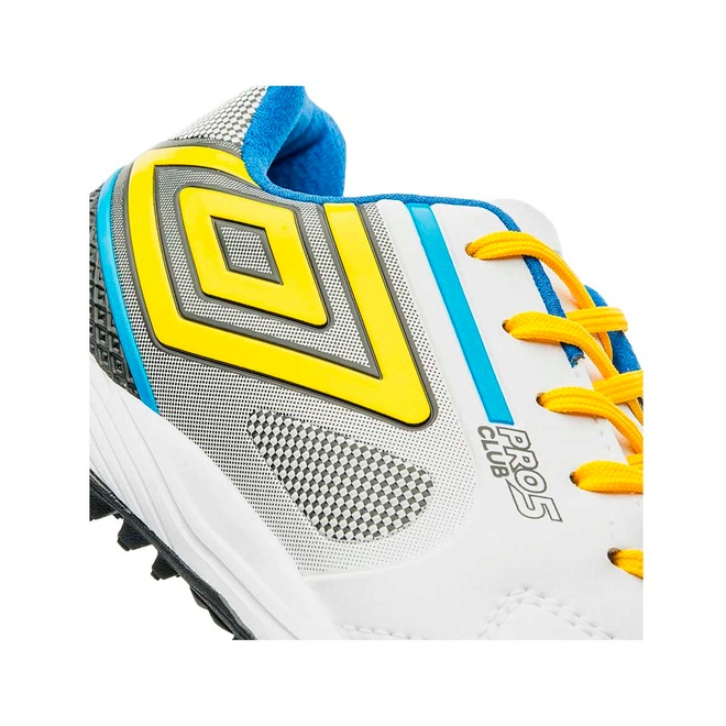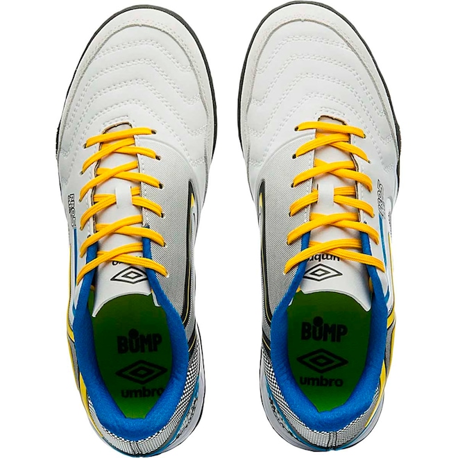 Seja o astro dos jogos com a Chuteira Society Umbro Pro 5 Bump Club: a Pro 5 Club que você já conhece, agora com tecnologia BUMP na palmilha interna para maior amortecimento. O cabedal é assimétrico, construído em material laminado com textura emborrachada. Possui detalhes em alta-frequência combinados com serigrafia de três cores e detalhes em verniz com costura frontal para reforço. Solado de society HG de entressola de EVA de ponta-a-ponta e soleta em TPU, além de costura de reforço frontal.