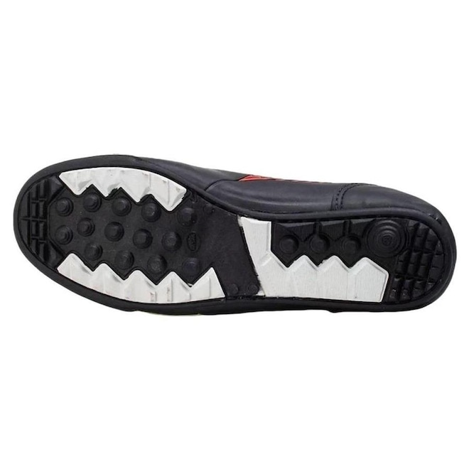 Composição cabedal: Confeccionado em sintético e PVC Palmilha: EVA Forro: Material têxtil Lingueta: Fina e flexível Solado: TPU com travas altas e fixas Ajuste: Cadarço Embalagem: Par