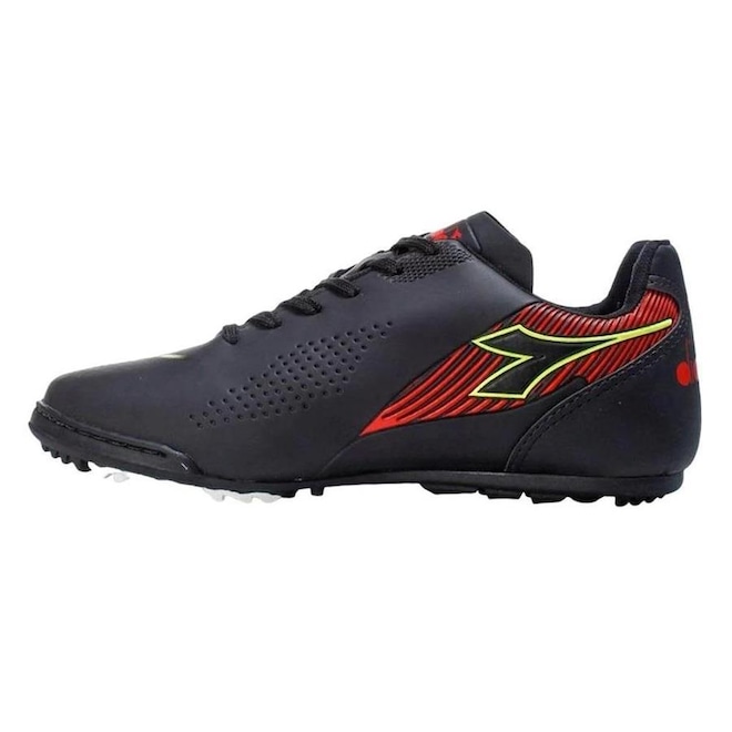 A Chuteira Diadora tem o cabedal em material sintético e PVC laminado.