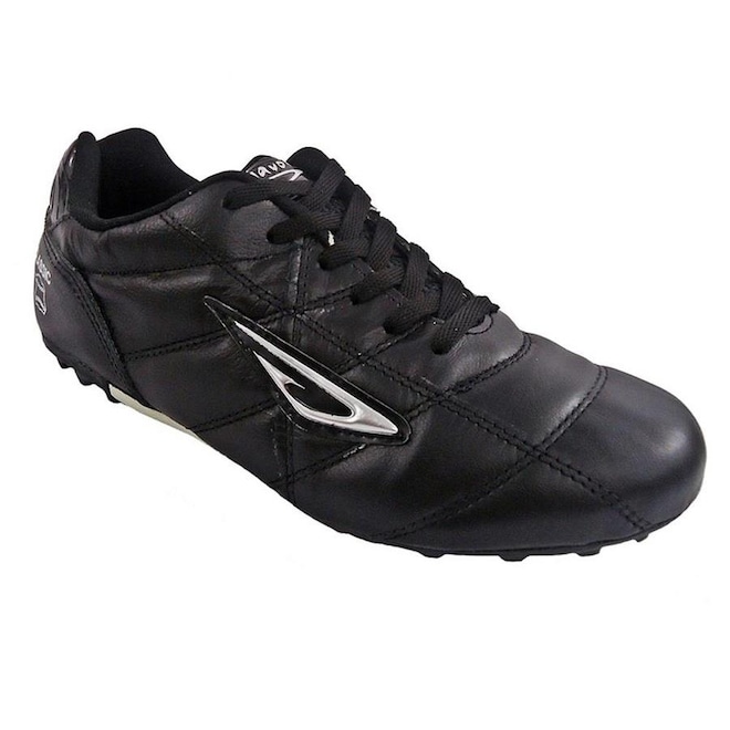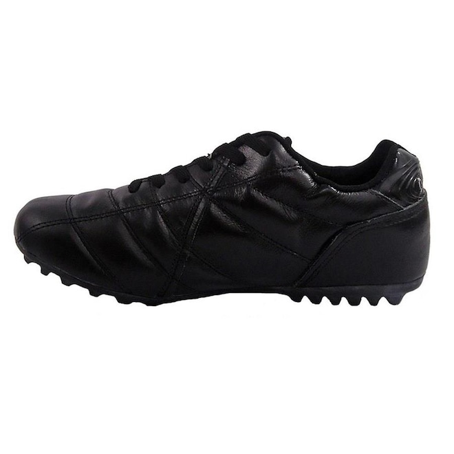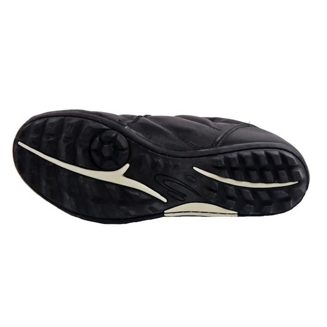 Fabricada em couro, a chuteira se ajusta facilmente ao pé. O modelo traz um desing novo, toda na cor preta, com travas de borracha, que deixa a pisada mais macia e confortável.