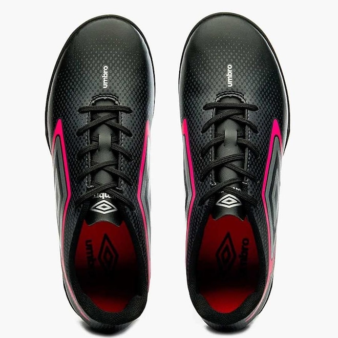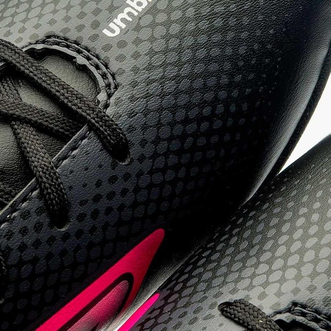 O cabedal é construído em material sintético laminado com aplicação de serigrafia em 3 cores e forro em tecido de poliéster. Possui Diamante Umbro na lateral estilizado com a assinatura do modelo, atacador convencional e palmilha interna em EVA forrado. O solado de society HG é composto por blenda de TPU e PVC.