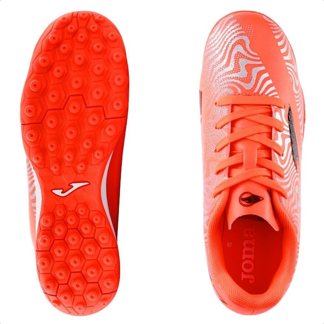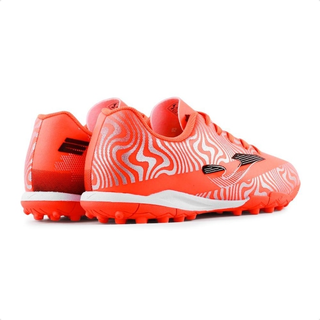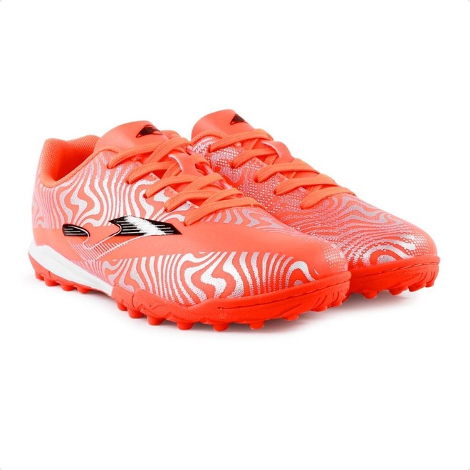 Solado em borracha com travas estratégicamente posicionadas garante excelente tração e aderência em quadras de society, permitindo que o atleta execute dribles, passes e chutes com precisão.