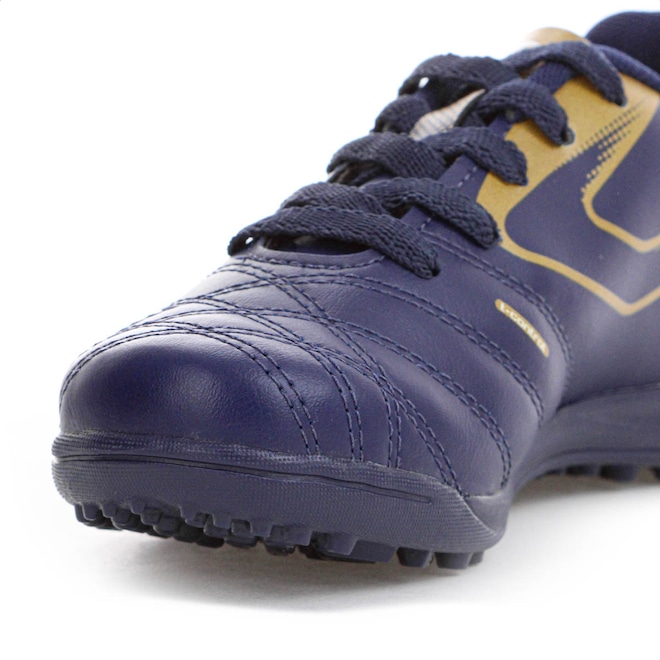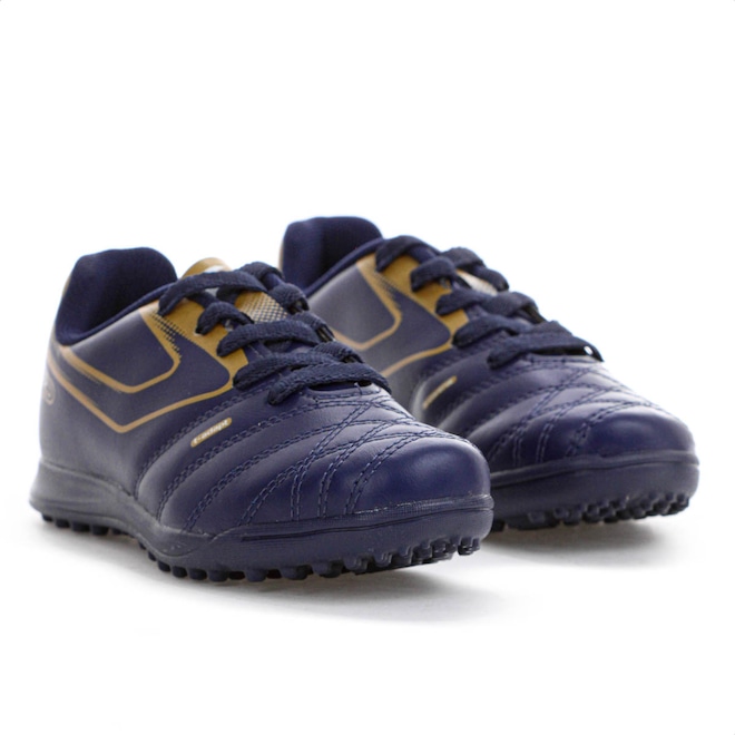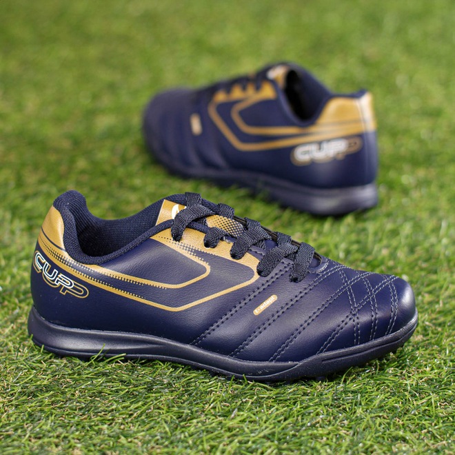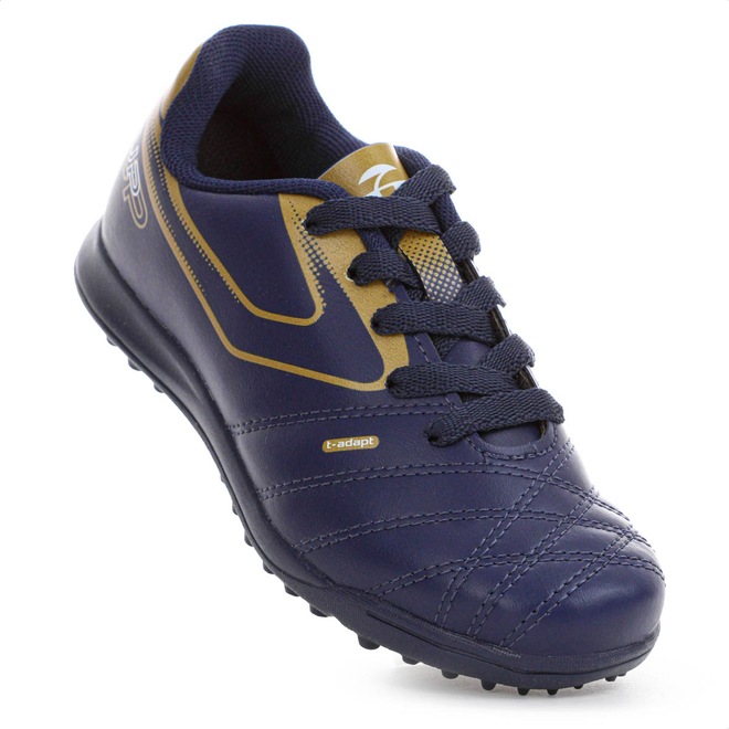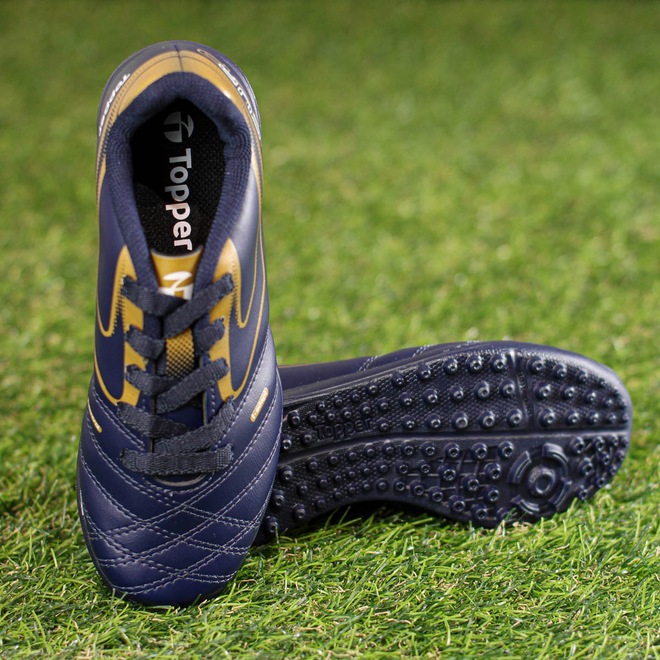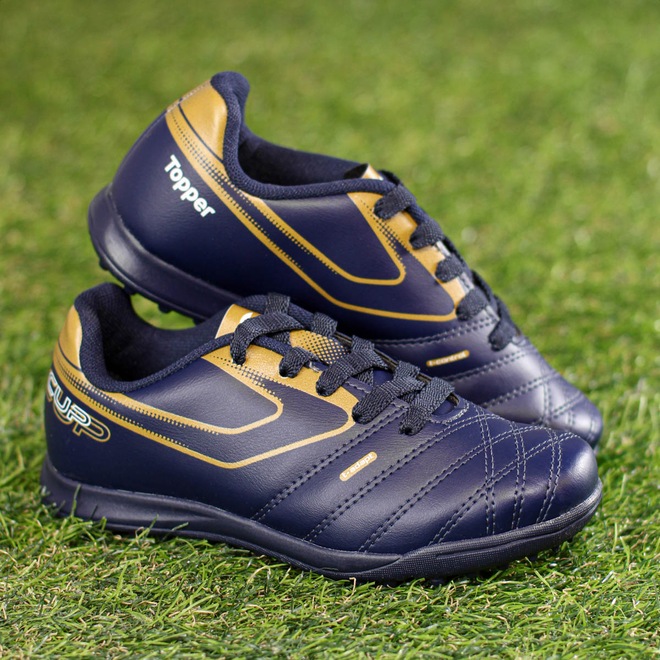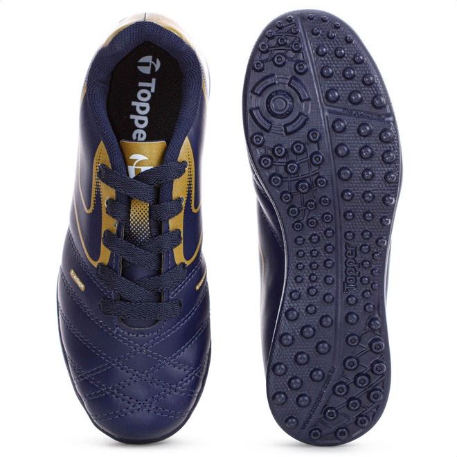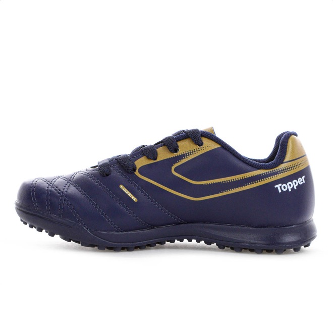 Leve o controle e o estilo para os gramados! Chuteira Topper Society Cup VIII Azul Marinho e Dourado - Infantil Ficha Técnica: Marca: Topper Cor: Azul marinho e dourado Cabedal: Cabedal em sintético para resistência e flexibilidade Gênero: Infantil Palmilha: Têxtil Sola: Borracha Fechamento: Cadarço Estilo: Controle Trava: Sem Trava Tecnologias: Design leve para maior liberdade de movimento e cabedal macio para controle de bola Entressola: Solado projetado para grama sintética com excelente aderência e tração Indicação: Partidas e treinos em campos de grama sintética Detalhes: Símbolo da marca nas laterais da chuteira Garanta ao seu pequeno craque, jogadas precisas e muito estilo com a Chuteira Topper Society Cup VIII. Porque investir: Desenvolvida para crianças que não abrem mão de desempenho, ela conta com cabedal em material sintético que oferece resistência e conforto. Seu solado em borracha com tração ideal para gramados sintéticos proporciona segurança e estabilidade em cada movimento. Leve e confortável, ela permite agilidade e controle da bola do início ao fim do jogo. Aposte no seu talento e jogue com quem entende do assunto. Conteúdo da embalagem: 1 par de Chuteira Topper Society Cup VIII Azul Marinho e Dourado - Infantil