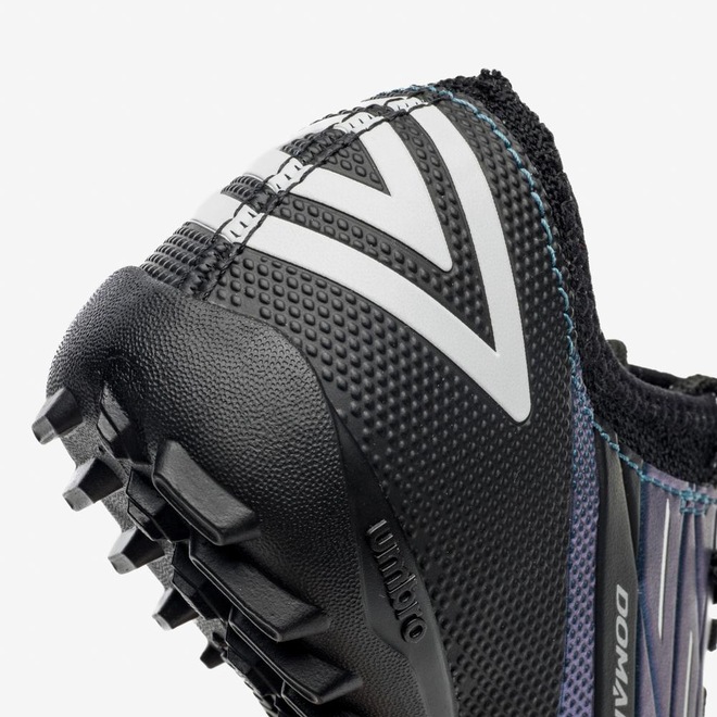 A Chuteira Society Umbro Domain Jr se destaca pelo seu grafismo em efeito camaleão, que confere um visual único e atraente. O cabedal assimétrico, confeccionado em material laminado com efeito iridescente, não apenas chama a atenção, mas também garante durabilidade e resistência, ideal para o uso em campos de grama sintética.