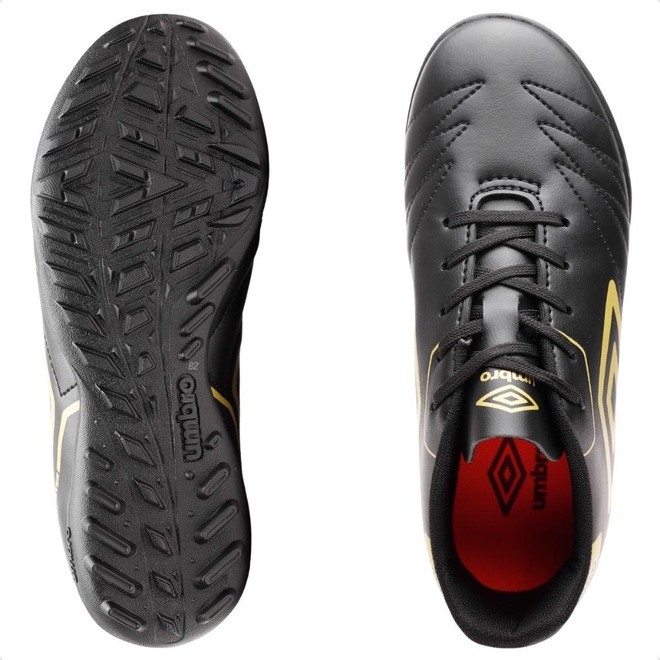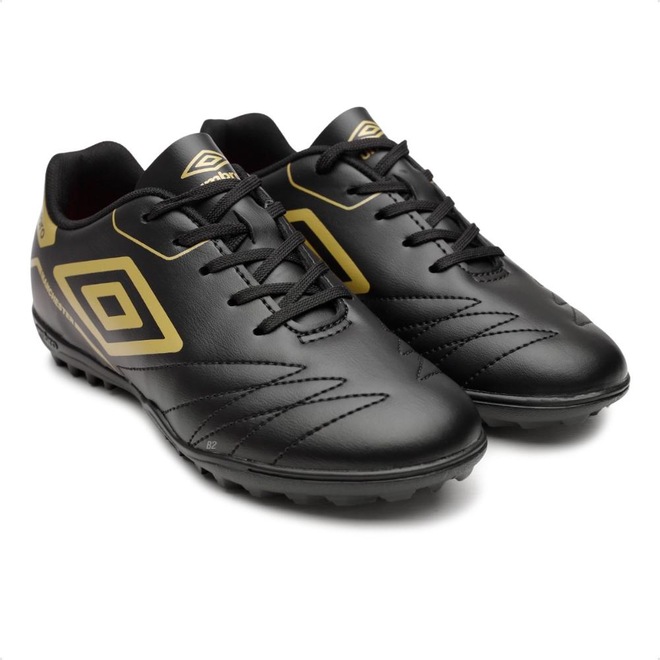 O cabedal em material de alta durabilidade garante ótimo controle de bola, enquanto o solado em borracha com travas baixas proporciona tração eficiente nos gramados artificiais.