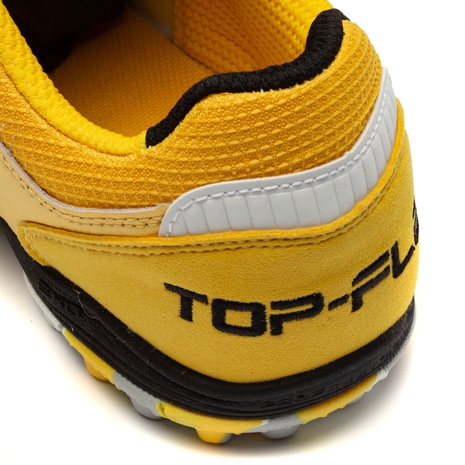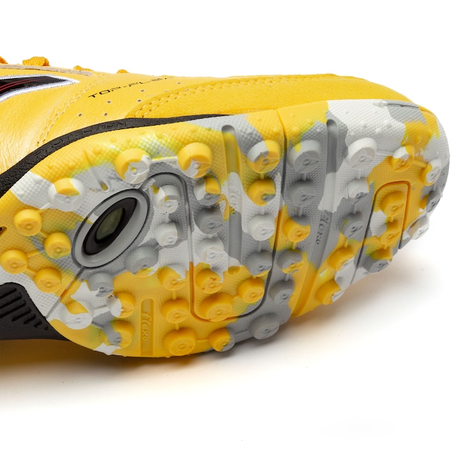 O solado, com borracha de alta resistência à abrasão e tecnologia DIN-70, retarda o desgaste, aumentando a vida útil da chuteira.