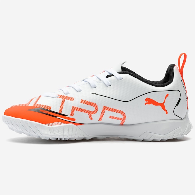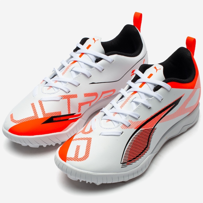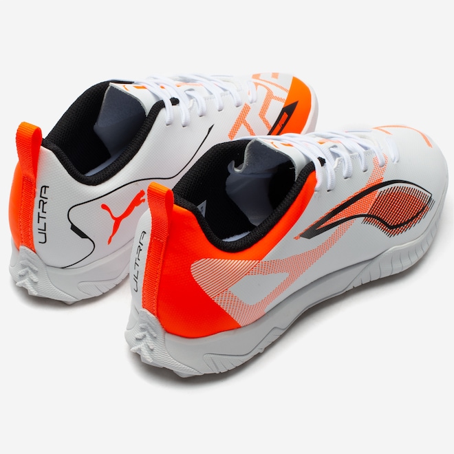 A PUMA ULTRA 5 PLAY traz cabedal sintético leve e puxador em tecido no calcanhar, facilitando o calce.