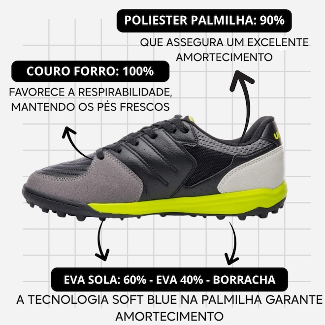 -Soft Blue: Palmilha com formulação especial em EVA, para conforto prolongado e amortecimento eficiente.