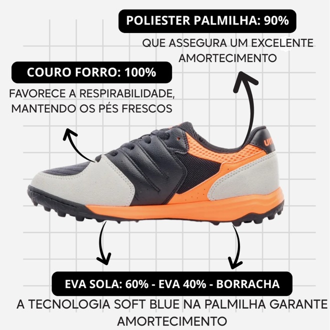 -Soft Blue: Palmilha com formulação especial em EVA, para conforto prolongado e amortecimento eficiente.