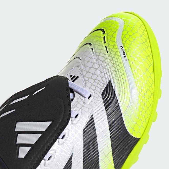 A Chuteira Society Adidas Predator League Fold‑Over TF foi desenvolvida para jogadores que buscam domínio absoluto da bola em campos sintéticos. Inspirada nos modelos iconográficos Predator, ela apresenta cabedal Hybridfeel com textura 3D e aletas adesivas Strikescale, que promovem maior controle na batida e dribles com precisão. A língua dobrável (fold‑over) garante ajuste firme e visual clássico, envolvente e funcional.