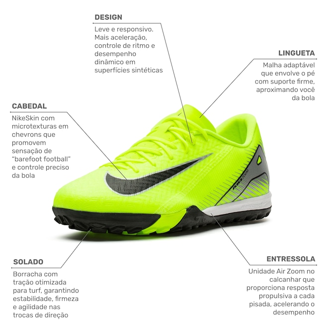 NikeSkin: Desenvolvido em PU fino e malha, proporcionando uma sensação leve, próxima do pé e um ajuste perfeito.- Nível - Amador