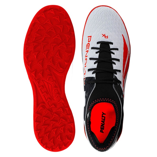 O solado de borracha com tecnologias Non-Marking e Ultra Grip proporciona excelente aderência e tração em superfícies de society, campo e futsal. A "bota" em elastano de alta resistência, construída com a tecnologia Locker, impede a entrada de sujeira e borrachinhas, mantendo o interior do calçado limpo e confortável.