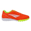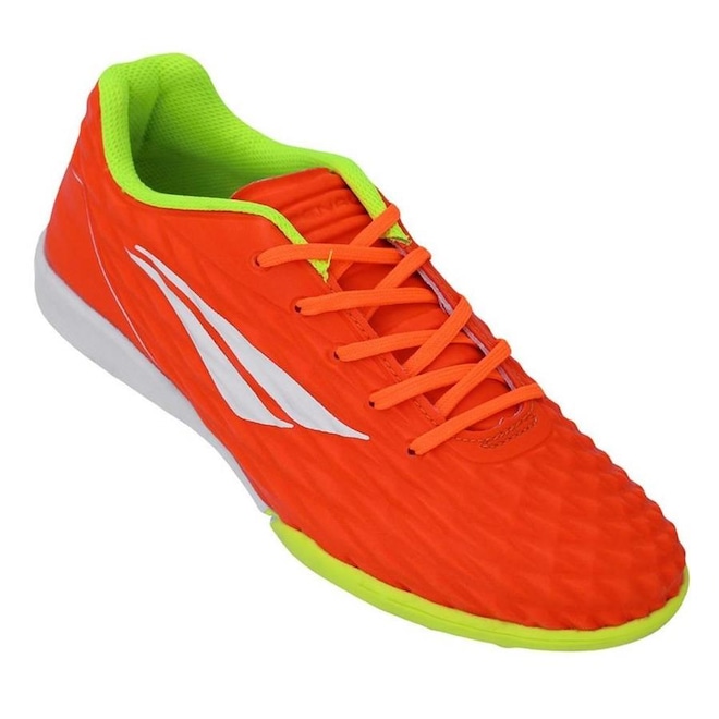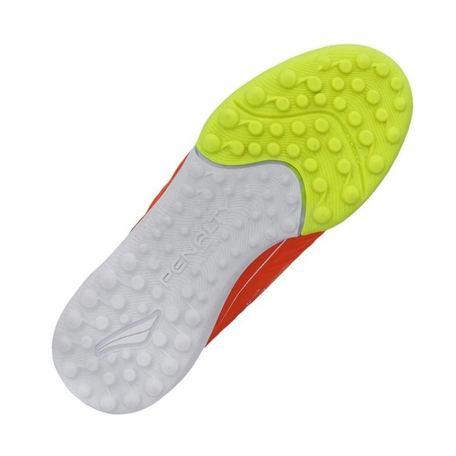 O solado totalmente de borracha conta com travas anatomicamente posicionadas para melhor tração e aderência ao gramado artificial.