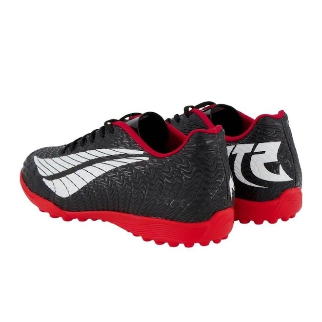 Conta com solado completamente emborrachado, trazendo a presença de travas baixas e fixas, garantindo assim, maior aderência e tração nos gramados artificiais.